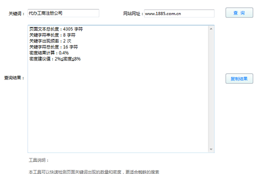 首先是查询关键词密度:因为网站所操作的关键词有很多,所以平均下来每个关键词都不可能有很高的密度。在我刚接手这个关键词的时候密度为0,也就是说首页根本没有我们的关键词,大家试想一下这样的词有可能上首页吗?只要有些优化常识的人应该就知道吧,这样的词哪怕有排名也是不太可能上首页的。所以我们增加了关键词密度