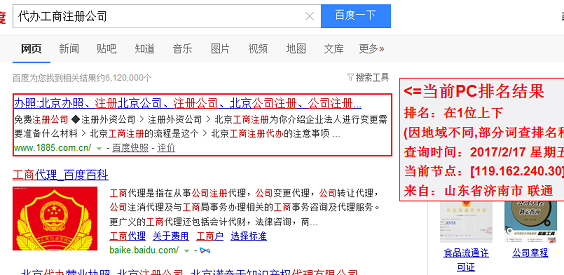 经过一个多月的努力终于让关键词代办工商注册公司达标,并且稳定在首页第一位。